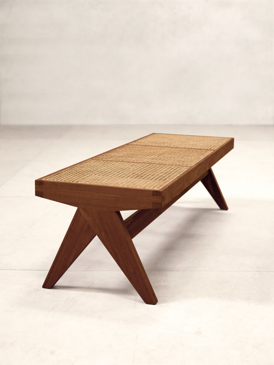 • Re-edition of the low teak bench , featuring a 3-seater cane lattice seat.